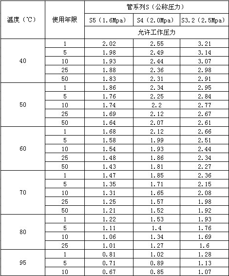 PB管道設(shè)計(jì)溫度、工作壓力使用壽命的對(duì)應(yīng)關(guān)系表格